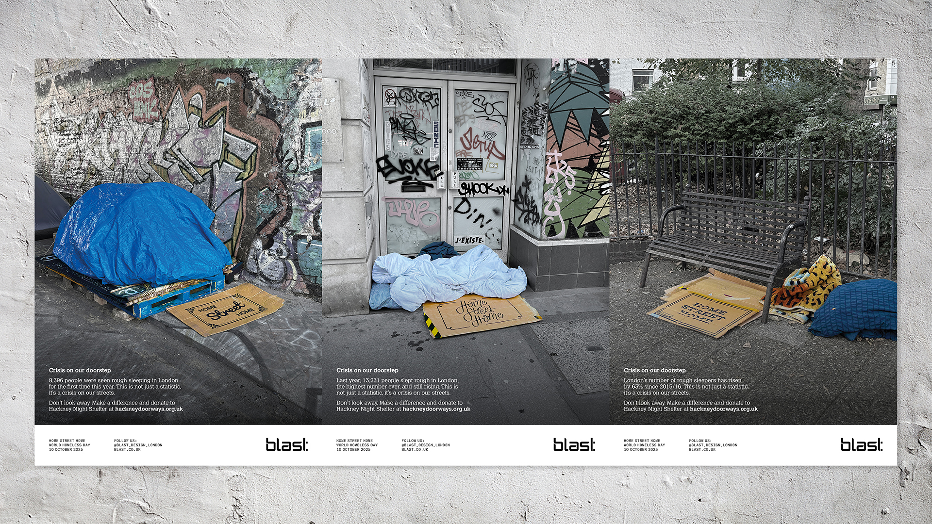At Blast, we believe design has the power to challenge and change. Home Street Home reflects our ongoing commitment to use creativity for good – to make people stop, think and, hopefully, act. The campaign was created in support of Hackney Night Shelter, who provide warmth, safety and hope for people experiencing homelessness.