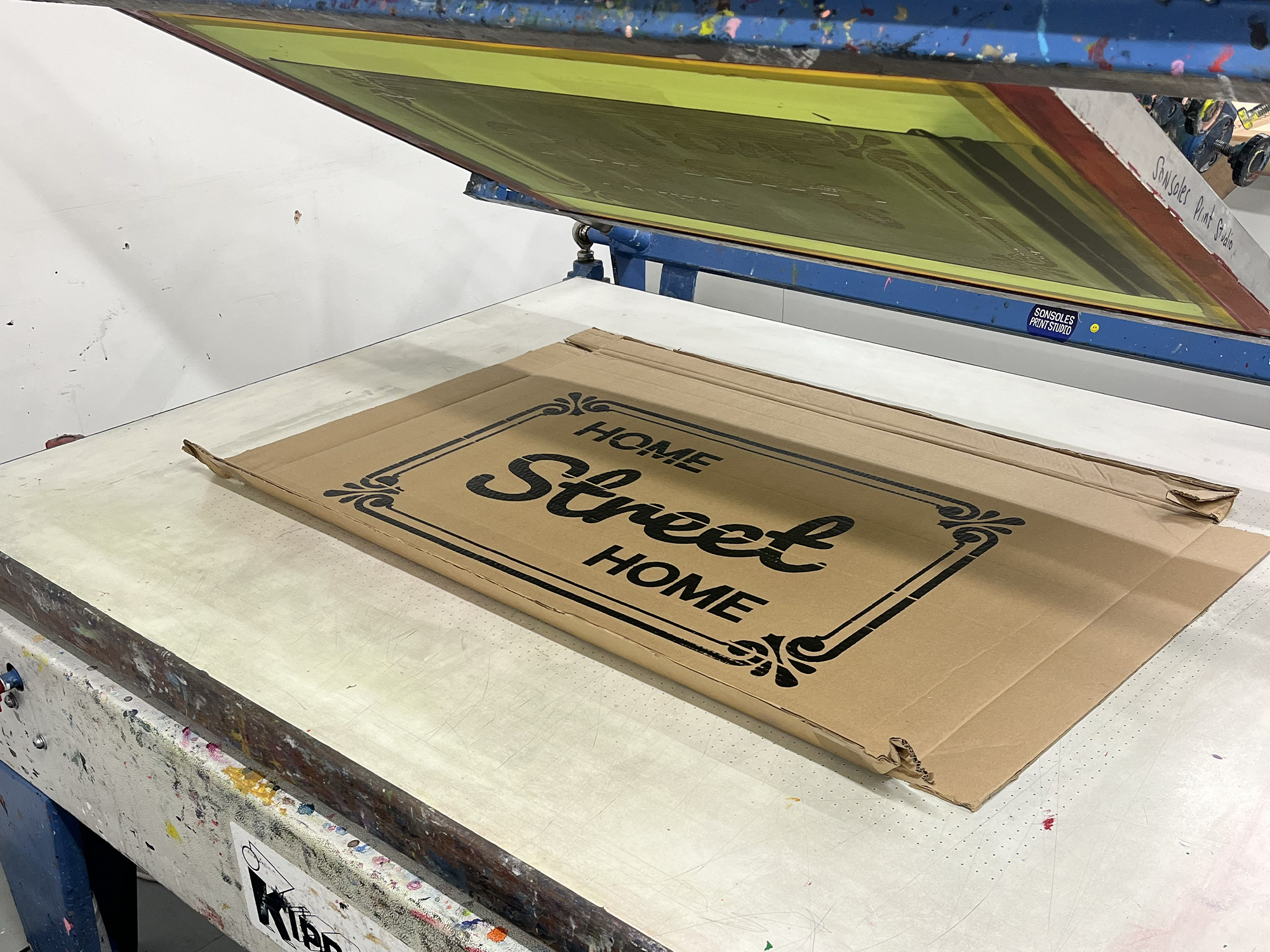 Each piece was screen printed by hand onto cardboard collected from the streets, creating makeshift ‘Welcome’ mats that were then photographed where people are sleeping rough. The concept, design, printing and photography were all created by our designer Jemima, who took the idea from sketch to street – a hands-on process that mirrors the raw, uncomfortable truth at the heart of the campaign.