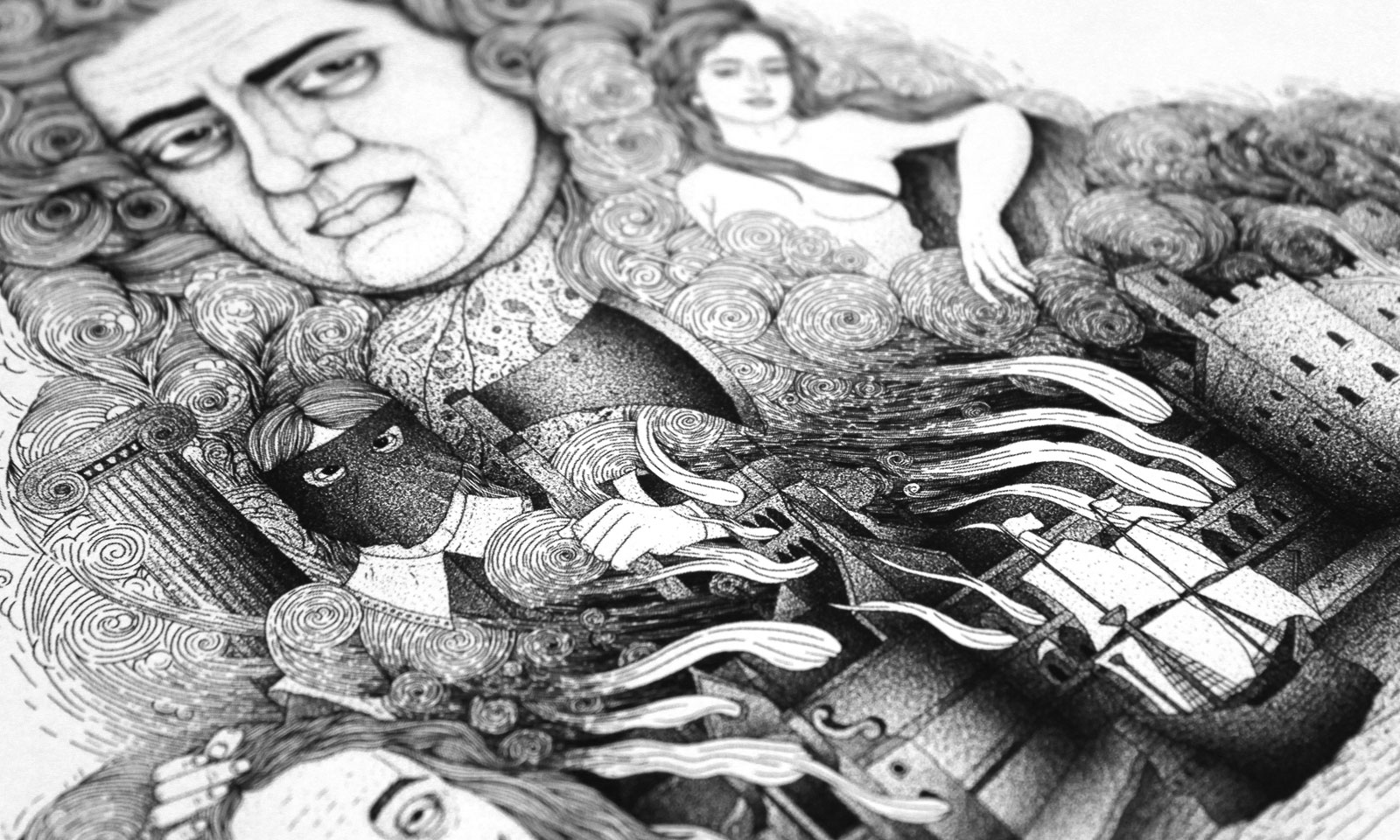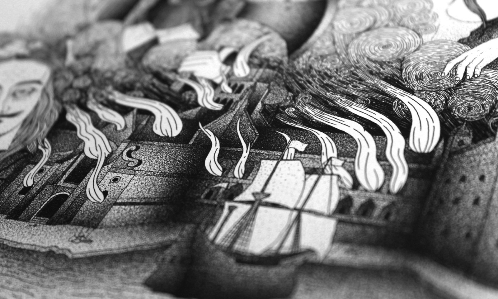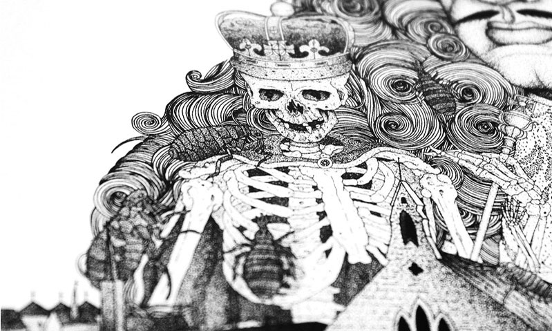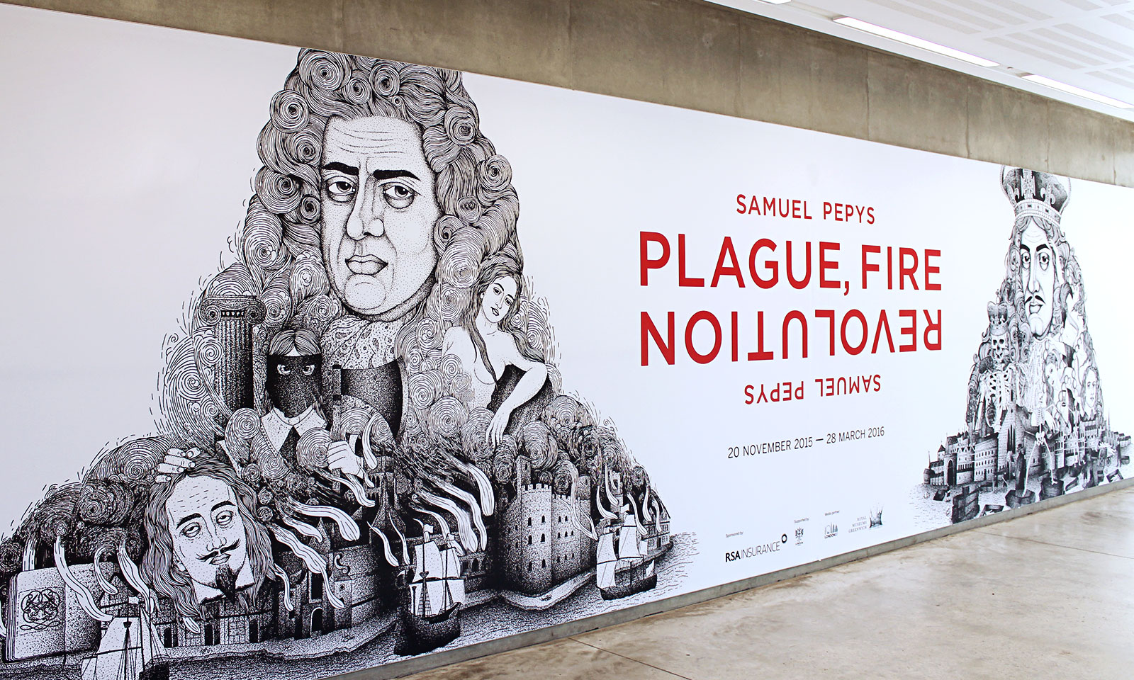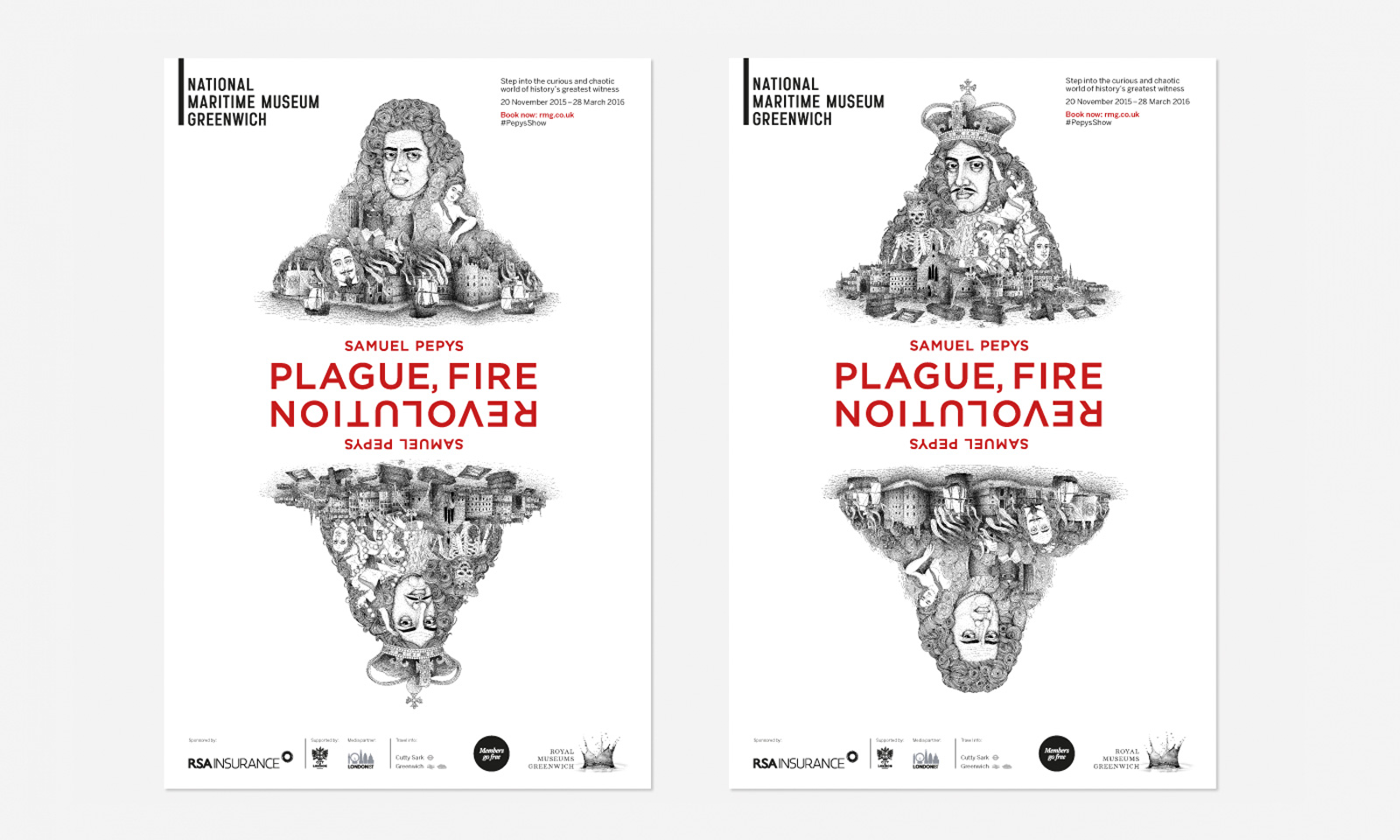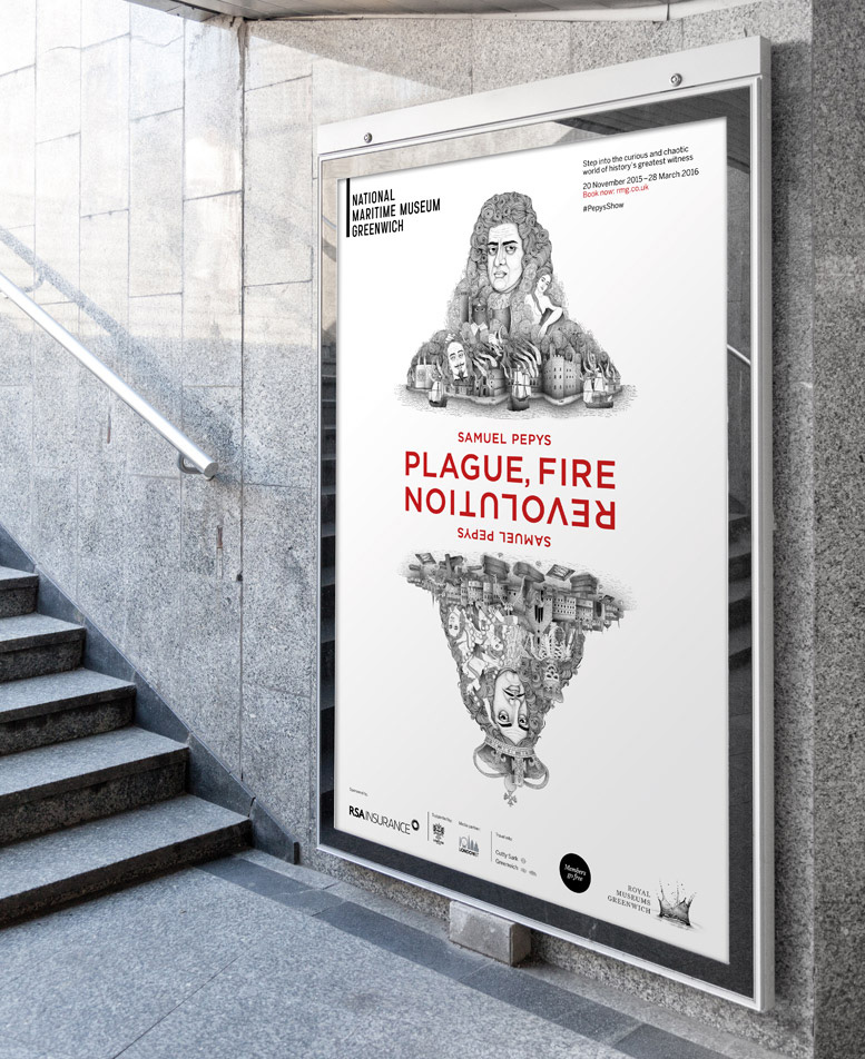 ‘Private Passions, Turbulent Times’ provided the inspiration for the duality in our campaign concept for the National Maritime Museum’s latest major exhibition: Plague, Fire, Revolution. Working with the exhibition’s curators, and using the exquisite, interwoven drawing style of illustrator Bradley Jay, we created images which introduce the exhibition’s two main protagonists, whilst depicting the curious and chaotic world of 17th Century London.